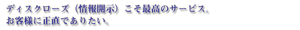 広告文句と違い、ご自分で見て確かめたものは絶対です。一物一価であるはずの中古車を修復歴の有無だけで区別することは大変無理がありますし、修復歴車全てを否定するつもりもありません。ただ、最も重要なことは、販売店がお客様に全てをディスクローズする姿勢・誠意だと当社は考えております。